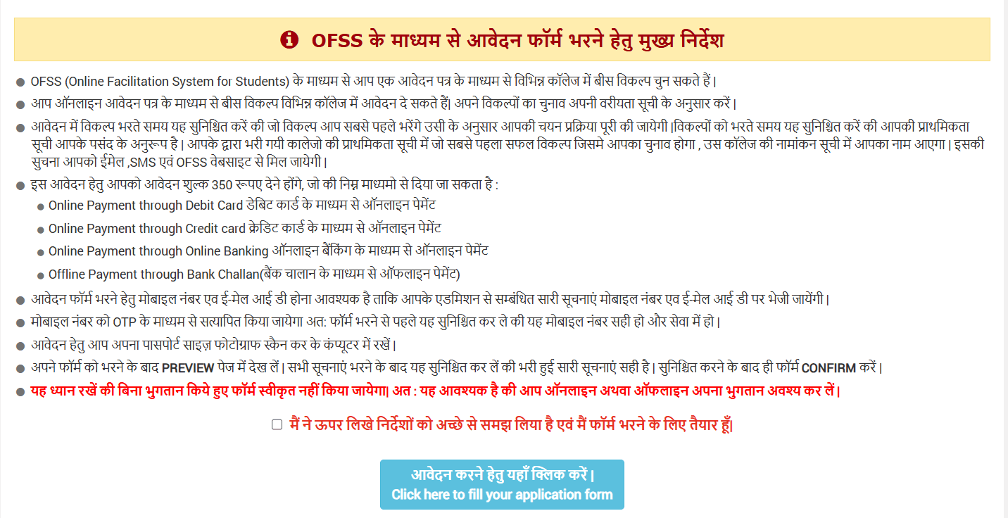 - OFSS के माध्यम से आवेदन करने हेतु मुख्य निर्देश को ध्यानपूर्वक पढ़े। और सहमत बटन पर क्लिक करके, आवेदन लिंक पर क्लिक कर दे।