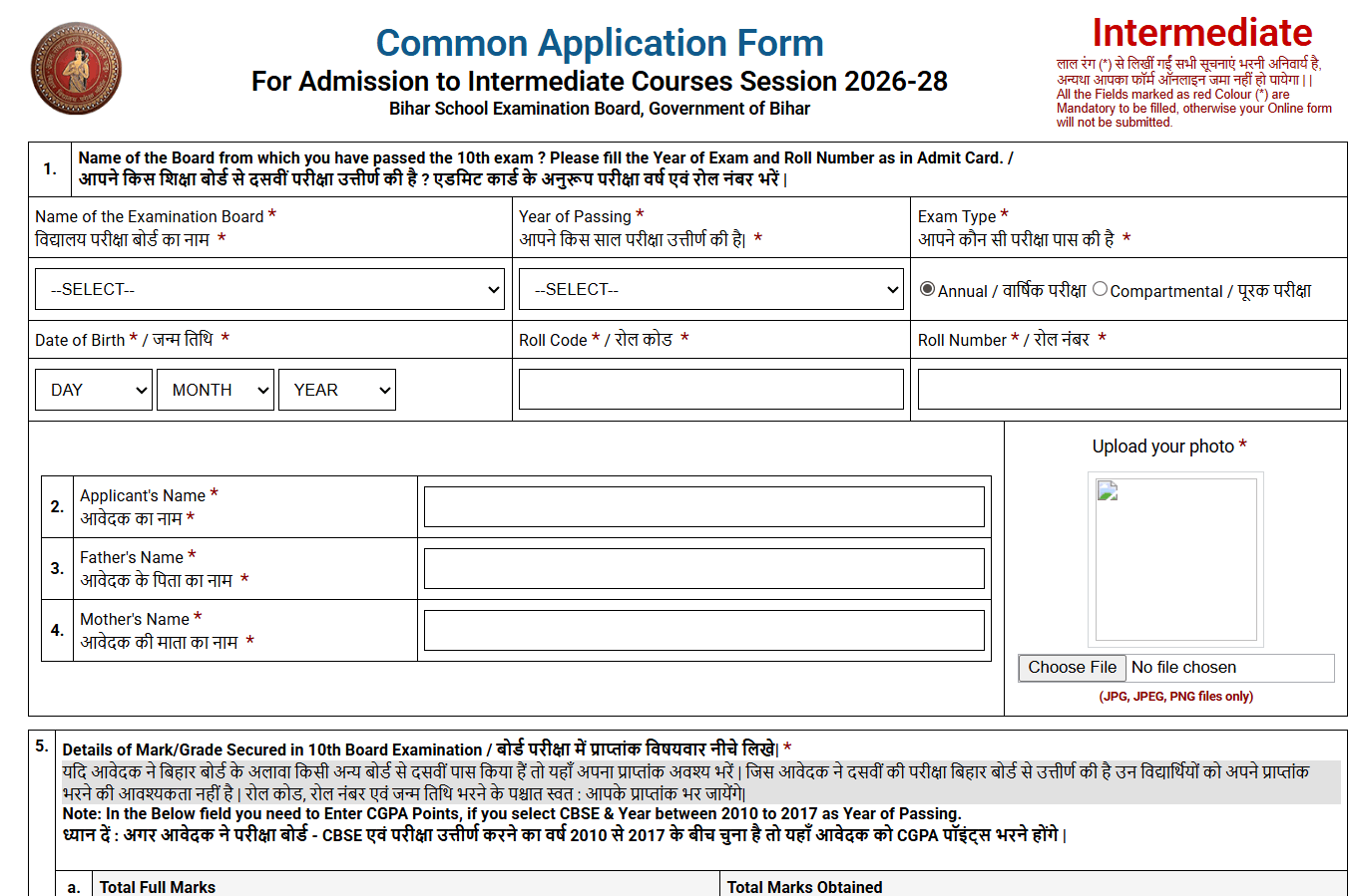 | 2. | यदि आपने कक्षा 10वीं बिहार से लेकिन किसी अन्य बोर्ड से किया है तो अपना कुल और प्राप्तांक अपने पास रखे। |