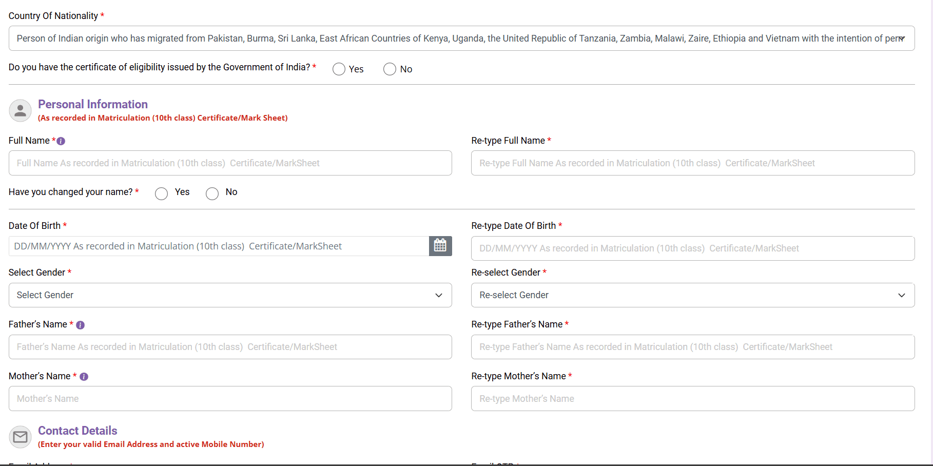- Step.3 यहाँ कंडीडेट सबसे पहले अपनी नॅशनलिटी का चयन करे और पर्सनल डिटेल्स में अन्य जानकारी सही सही भरे। जैसे नाम, डेट ऑफ़ बर्थ, जेंडर माता और पिता नाम आदि।