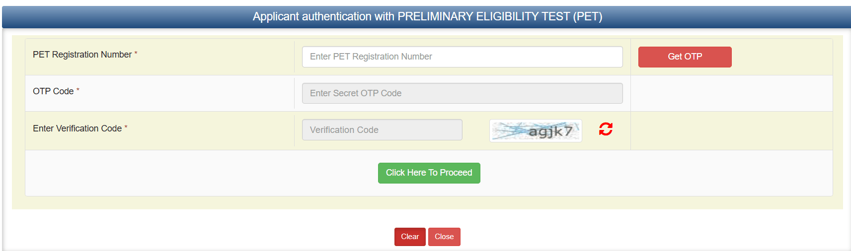 - Step.4 कंडीडेट को अपना पीईटी रजिस्ट्रेशन नंबर भरना है और ओटीपी तथा वेरिफिकेशन कोड फील करने के बाद क्लिक हियर टू प्रोसेस पर क्लिक करे।